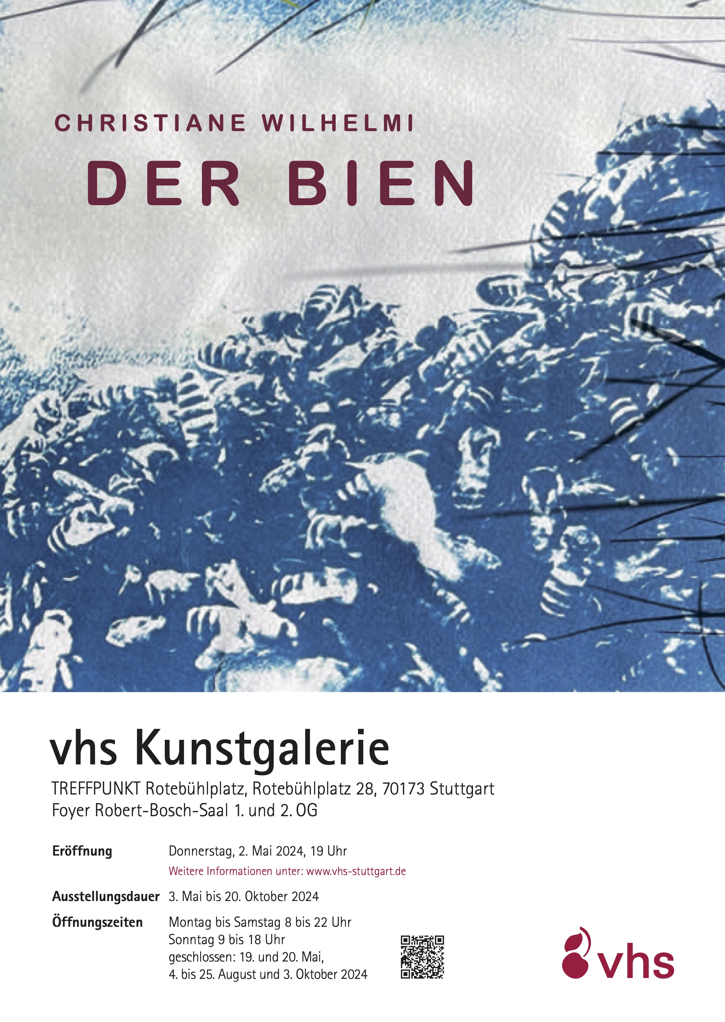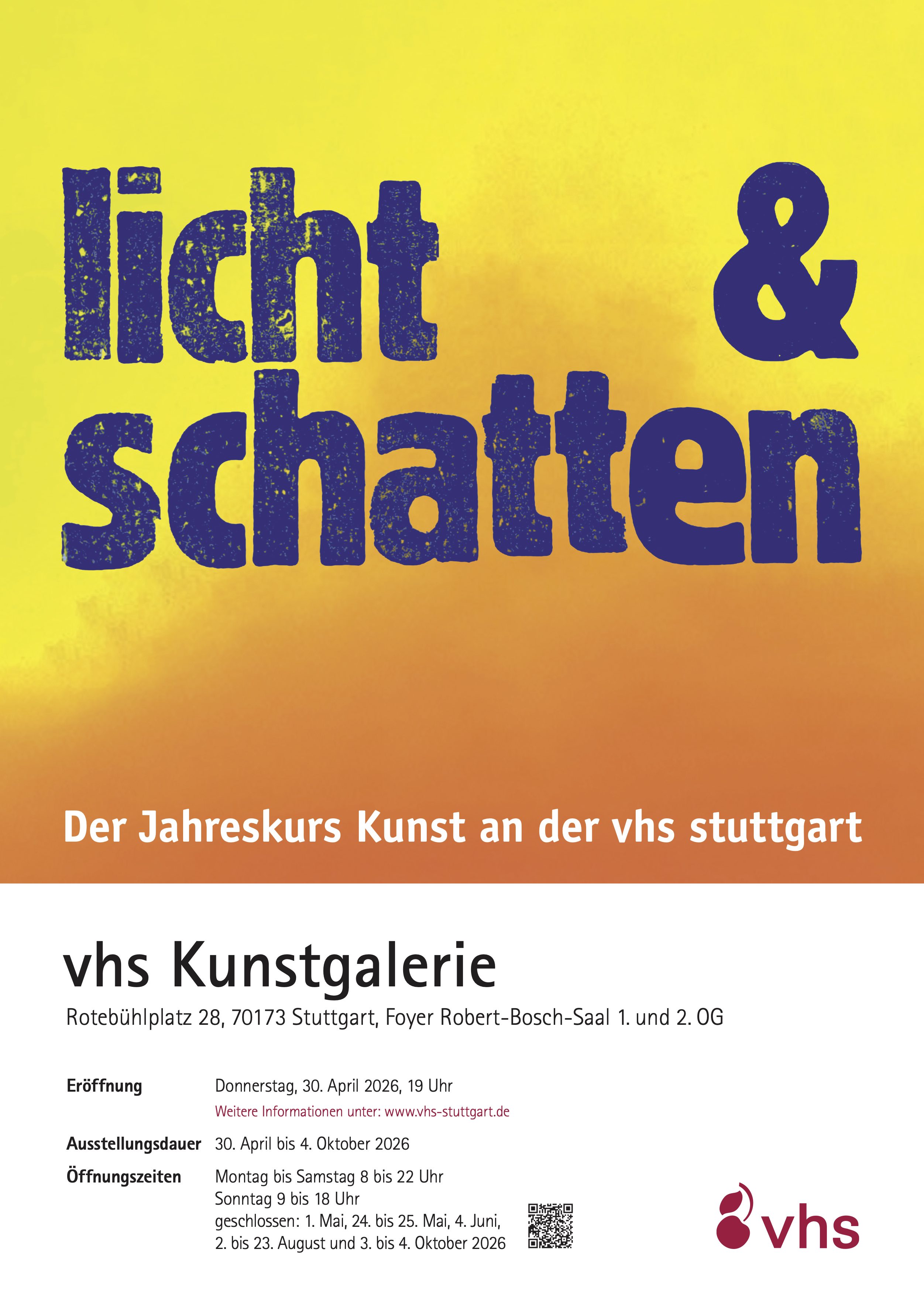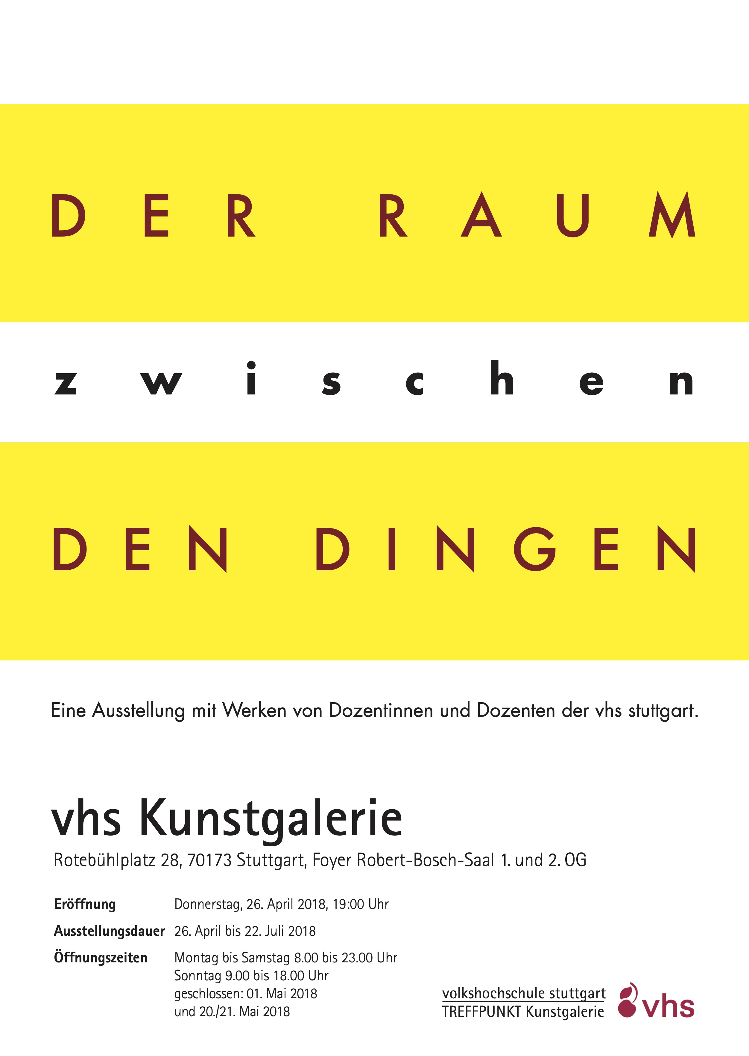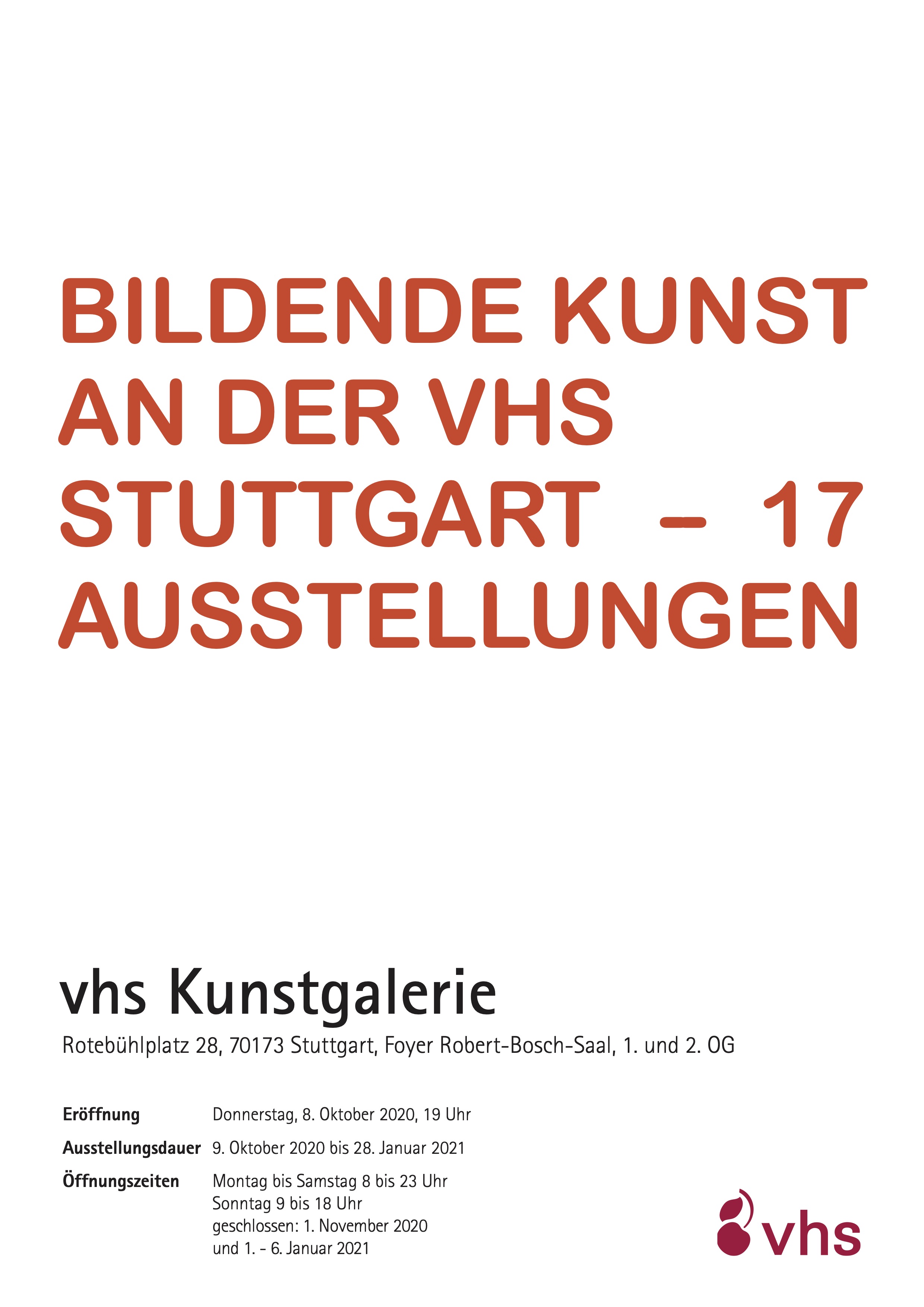 In der vhs Kunstgalerie im 1. und 2. OG des Treffpunkt Rotebühlplatz Stuttgart werden von mir 2 Ausstellungen pro Jahr kuratiert. Gezeigt werden Werke von KünstlerInnen die an der vhs im Fachbereich Kunst und Gestalten unterrichten oder unterrichtet haben, sowie von KünstlerInnen und Initiativen, deren Arbeiten an diesem Ort inspirierende Impulse geben.