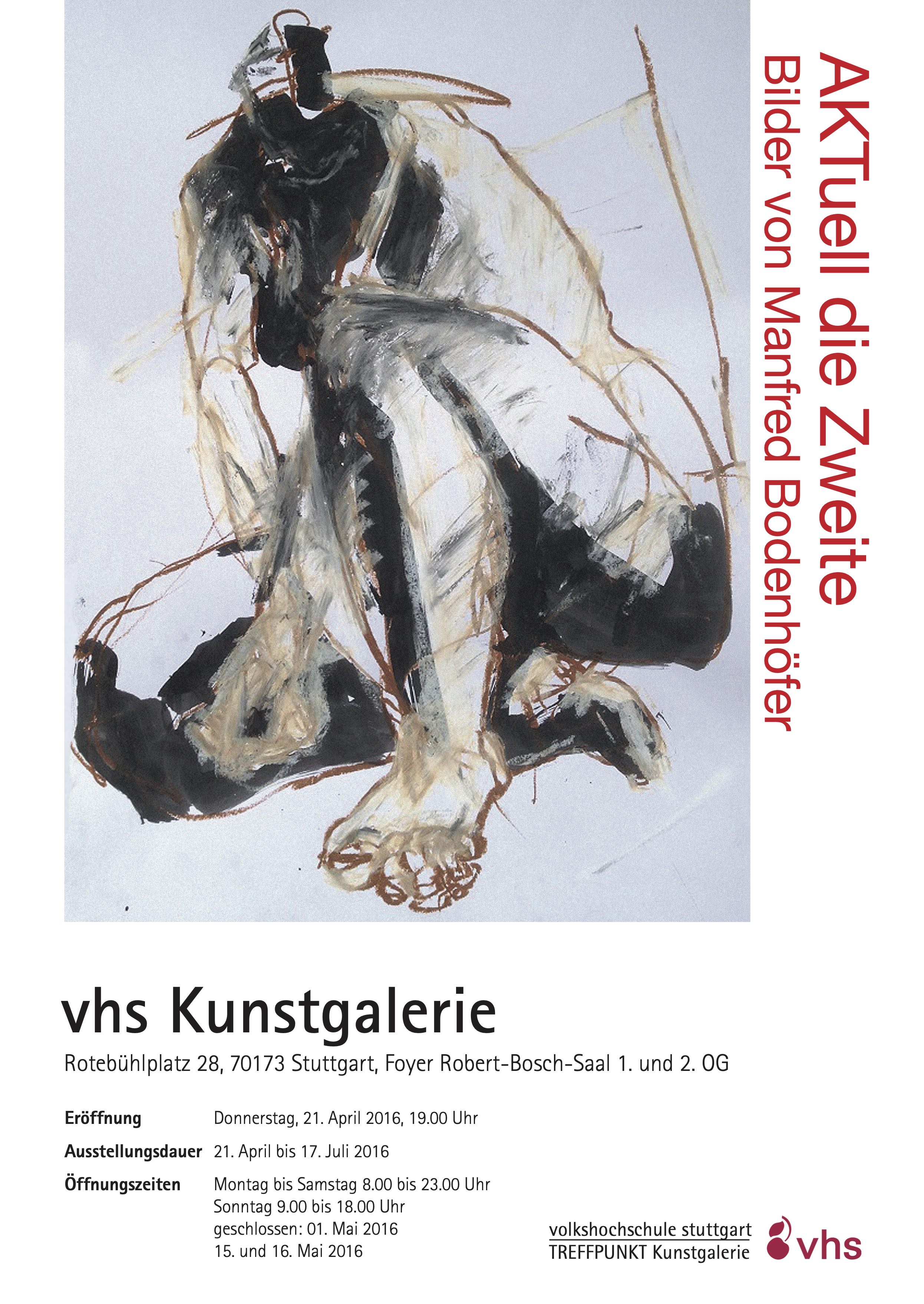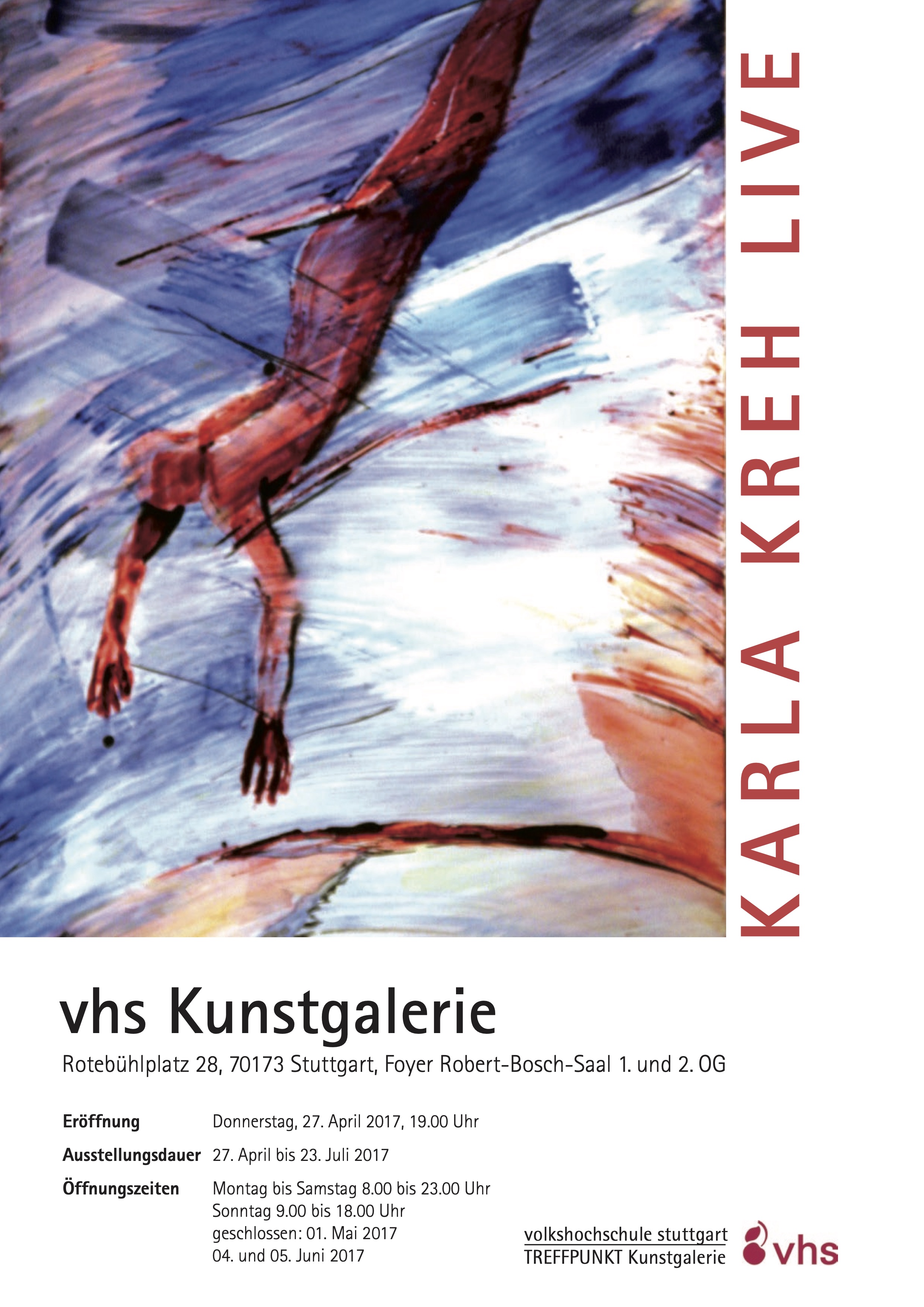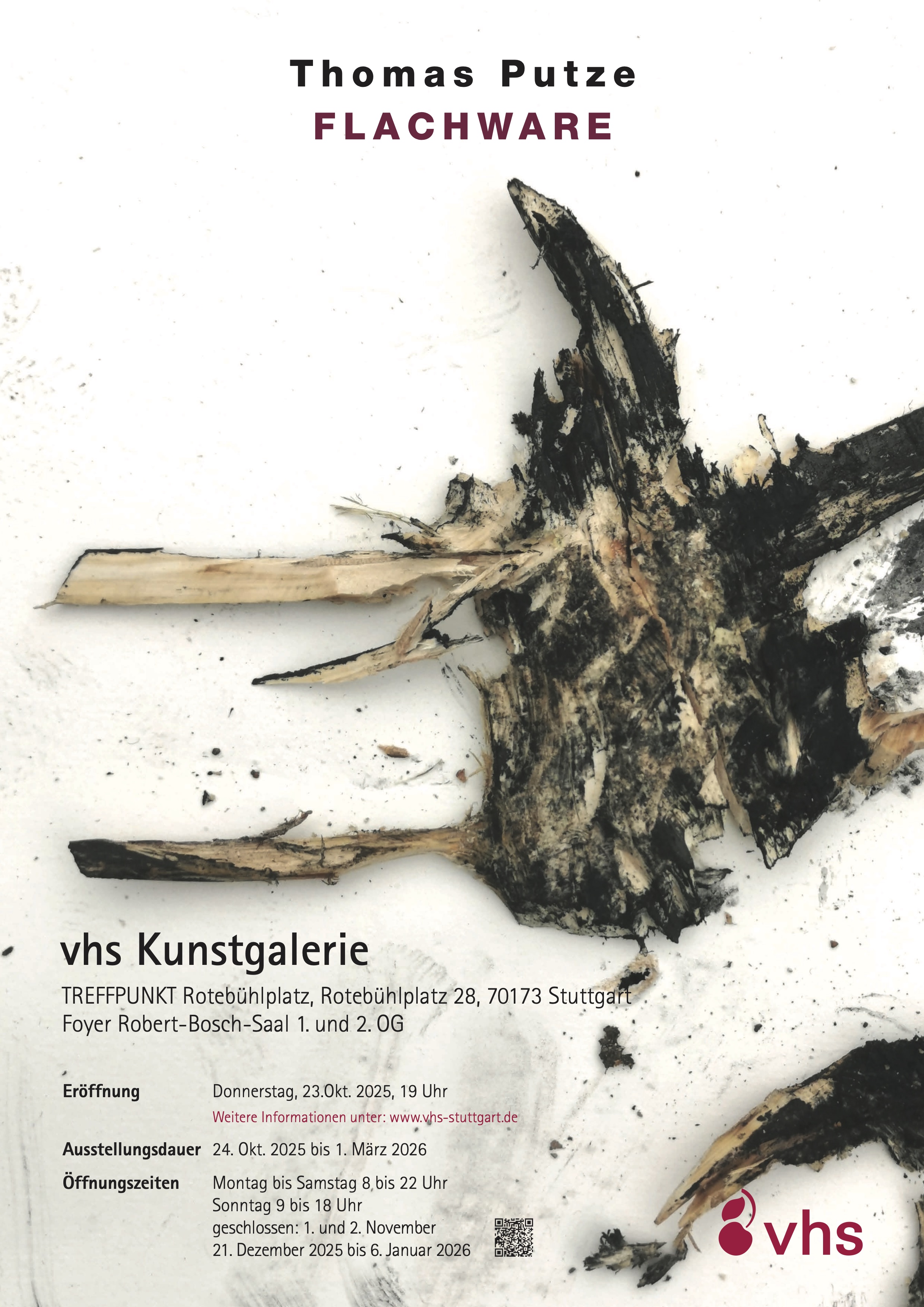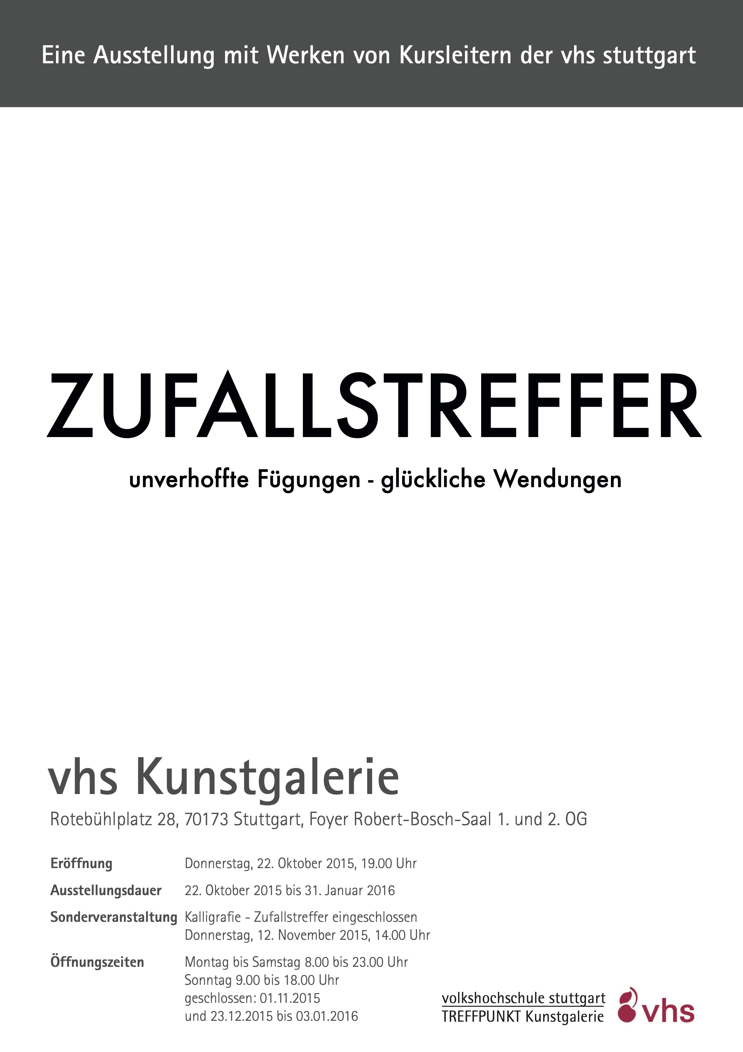 In der vhs Kunstgalerie im 1. und 2. OG des Treffpunkt Rotebühlplatz Stuttgart werden von mir 2 Ausstellungen pro Jahr kuratiert. Gezeigt werden Werke von KünstlerInnen die an der vhs im Fachbereich Kunst und Gestalten unterrichten oder unterrichtet haben, sowie von KünstlerInnen und Initiativen, deren Arbeiten an diesem Ort inspirierende Impulse geben.