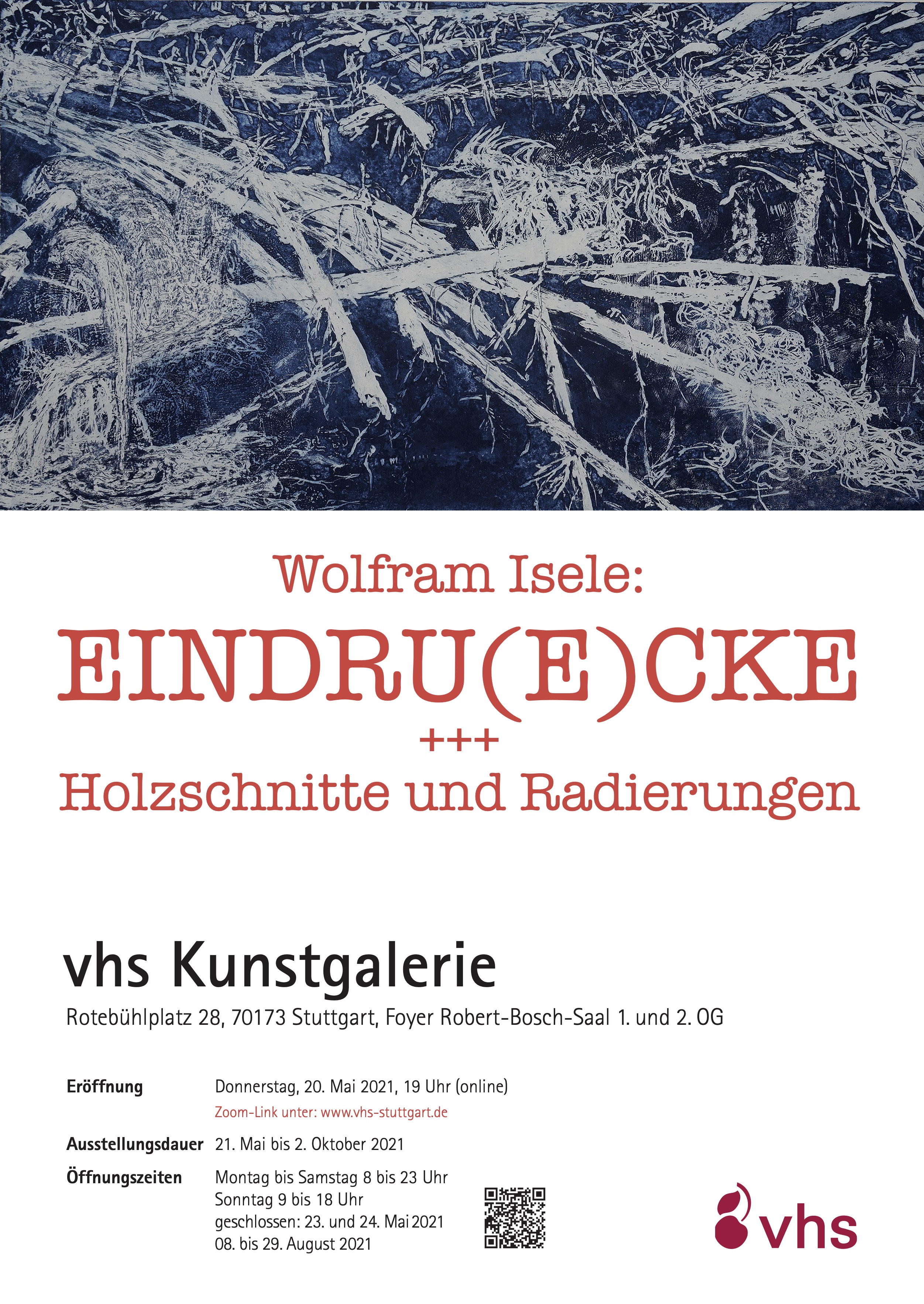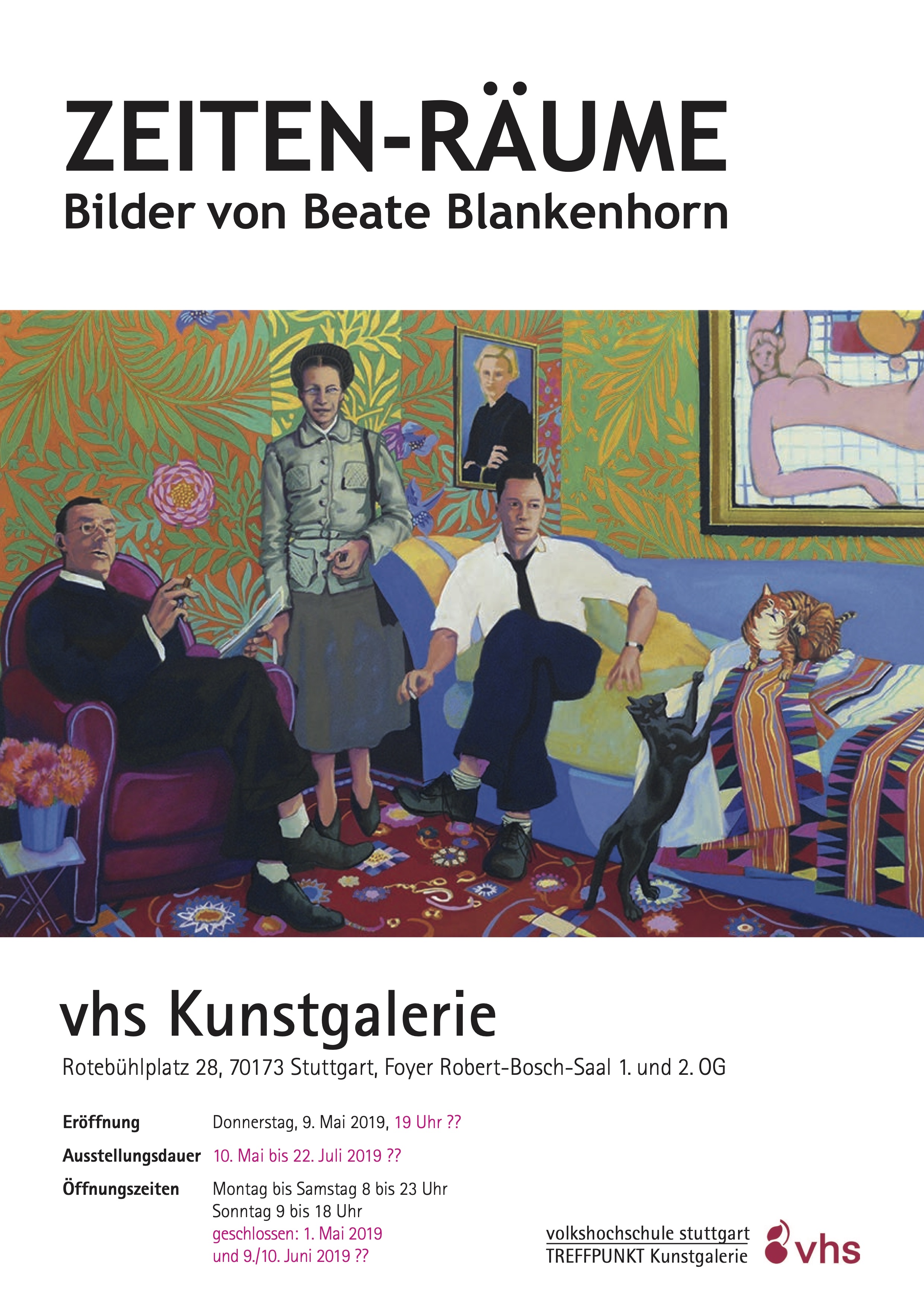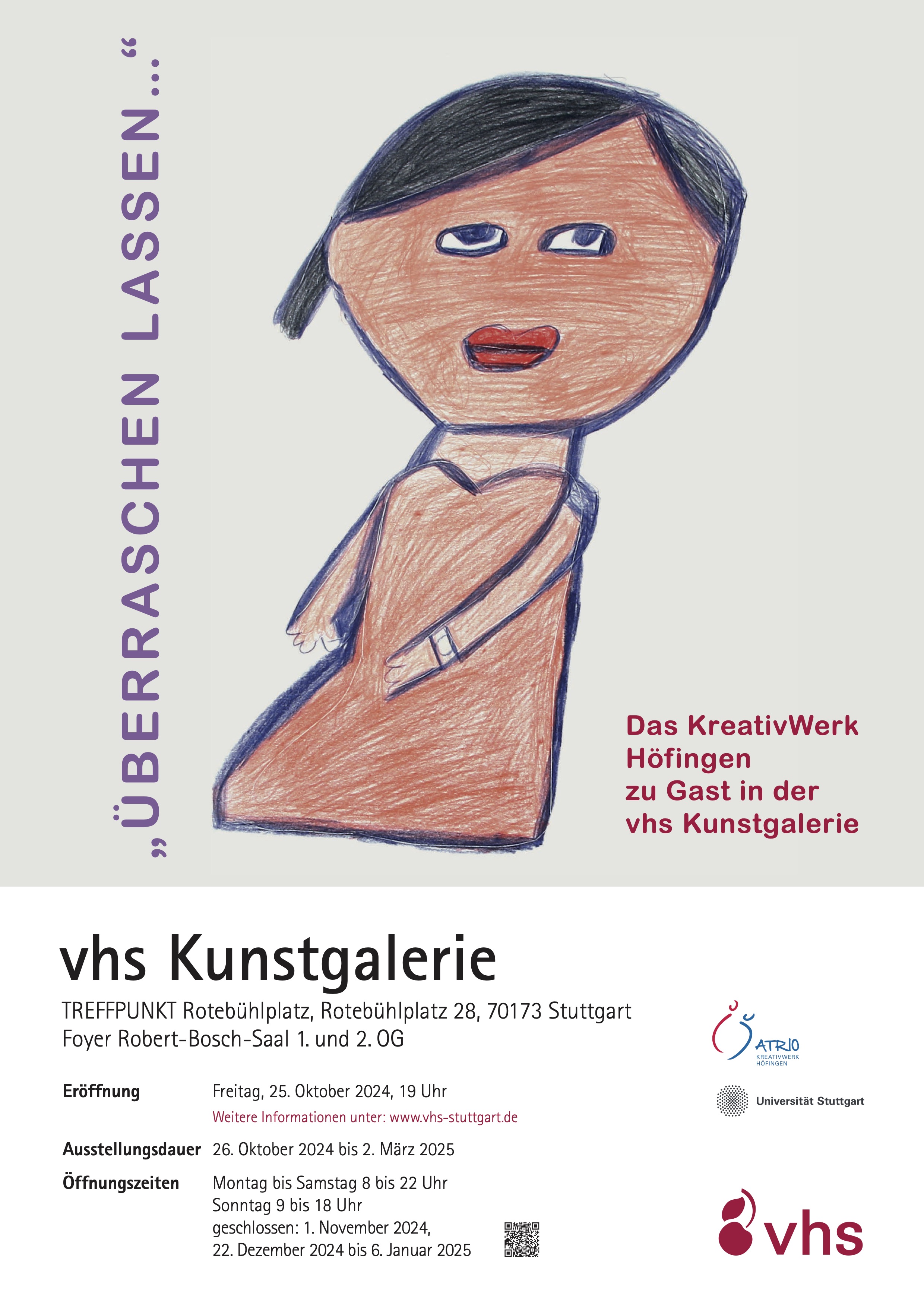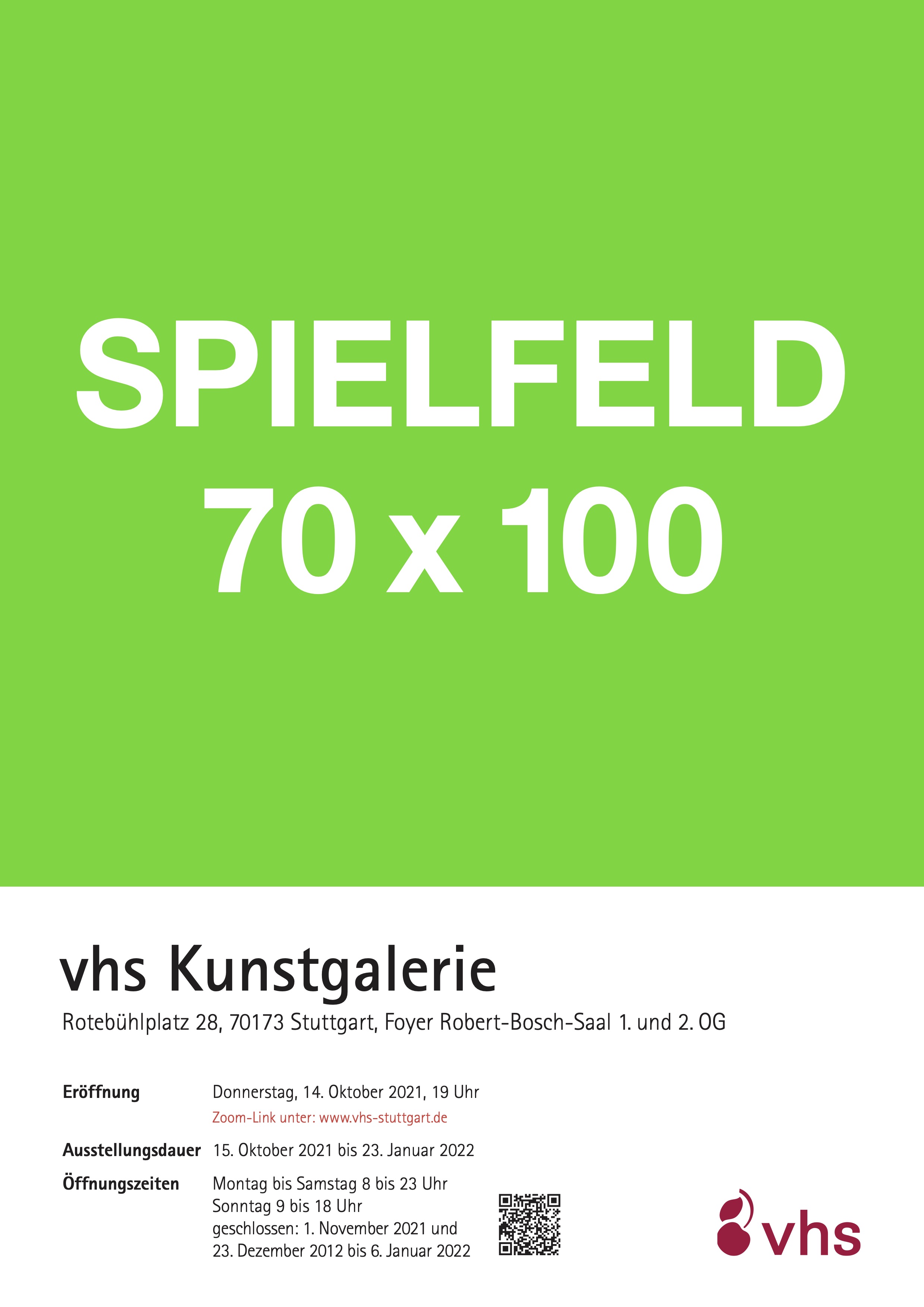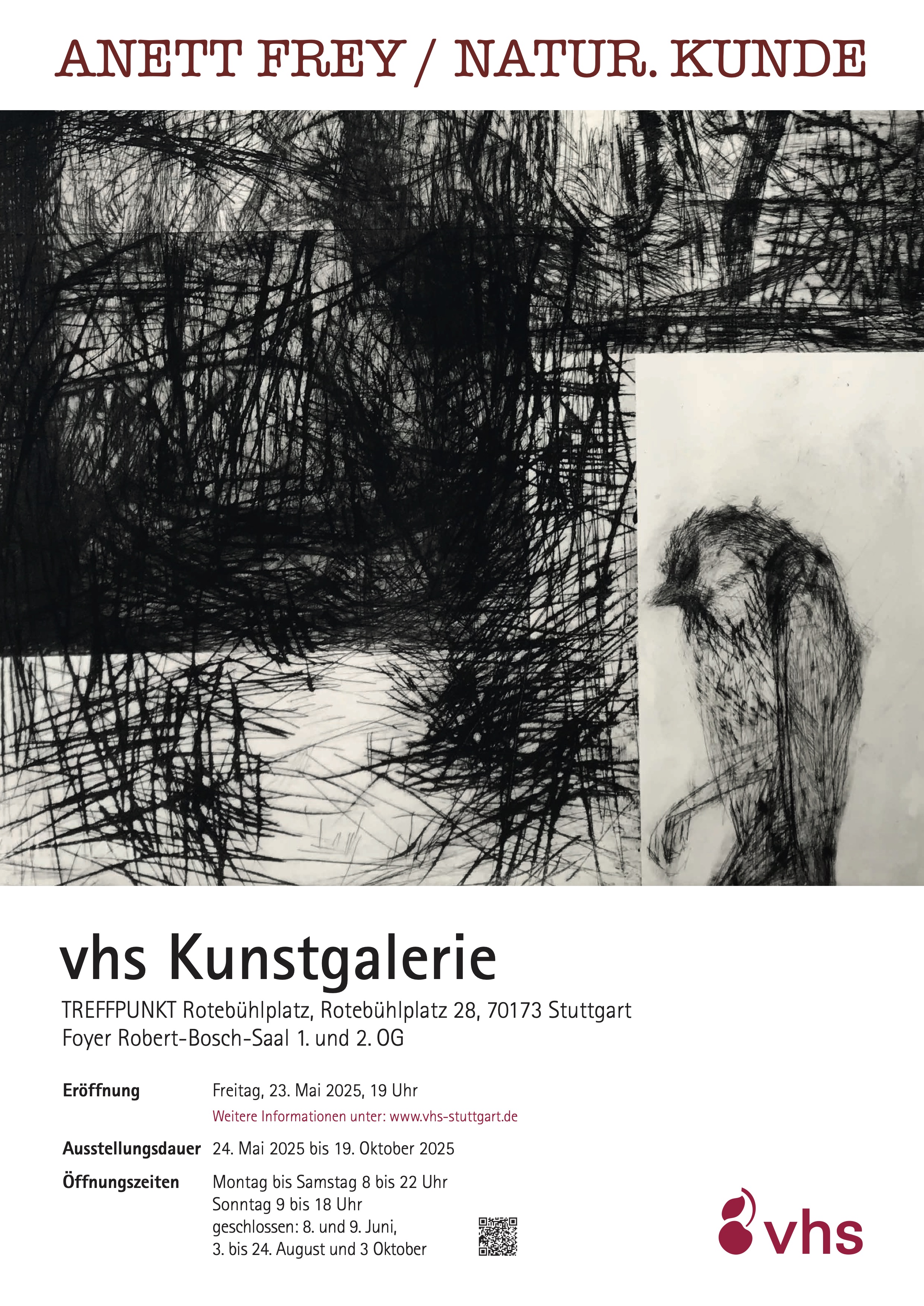 In der vhs Kunstgalerie im 1. und 2. OG des Treffpunkt Rotebühlplatz Stuttgart werden von mir 2 Ausstellungen pro Jahr kuratiert. Gezeigt werden Werke von KünstlerInnen die an der vhs im Fachbereich Kunst und Gestalten unterrichten oder unterrichtet haben, sowie von KünstlerInnen und Initiativen, deren Arbeiten an diesem Ort inspirierende Impulse geben.