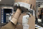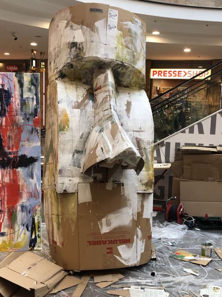 "Der Moai" Einkaufszentrum 'DasES', Esslingen 2022. Kartonage, Dachlatten, Acrylfarbe. Mit Unterstützung von Kursteilnehmern der Kunstakademie Esslingen.