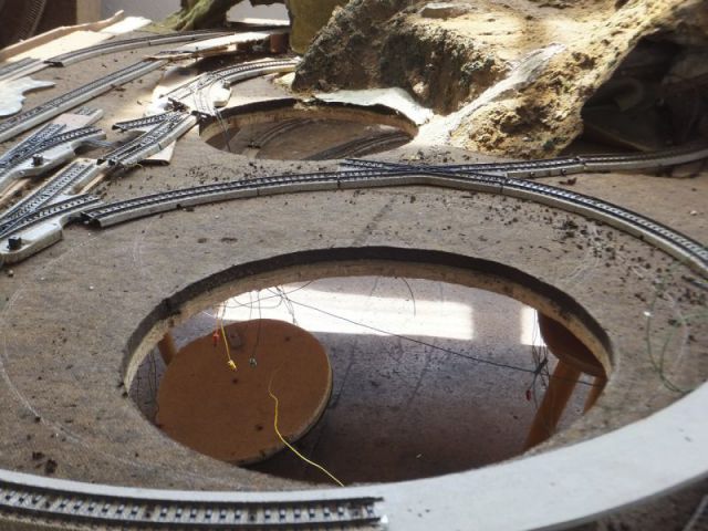 Scherbenkreis, Dreilampenplatz-Historie (links), gelochte Modelleisenbahnlandschaften, umgestülpter Stuttgarter Hauptbahnhof. Ausstellung 'Endstation Magistralia' Kunstverein Nürtingen 2013 (Fotos: Conny Geiger)